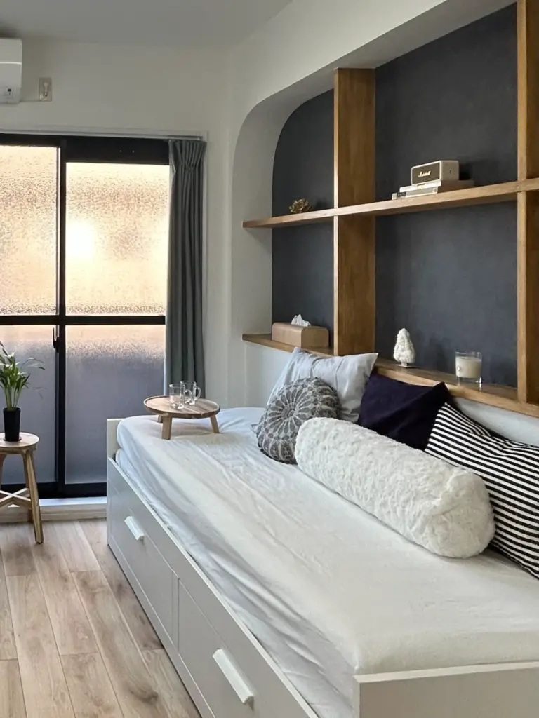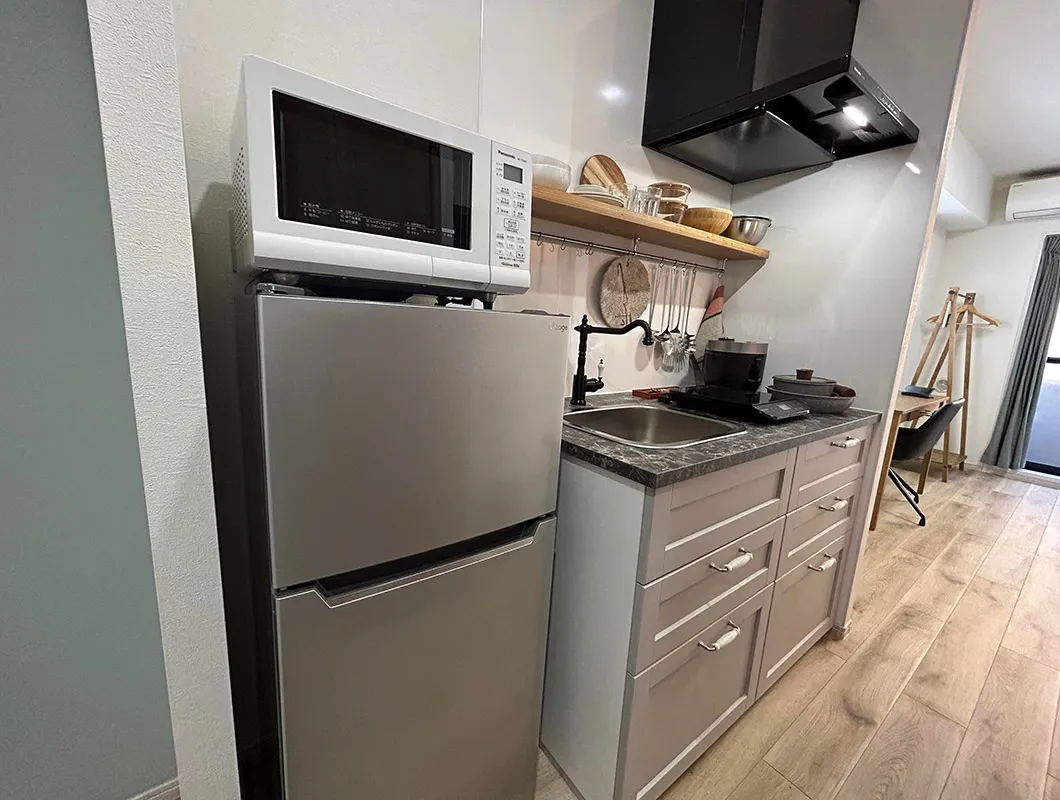 限られたスペースの中で、上手に家具やキッチン、家電などを配置した一室です。