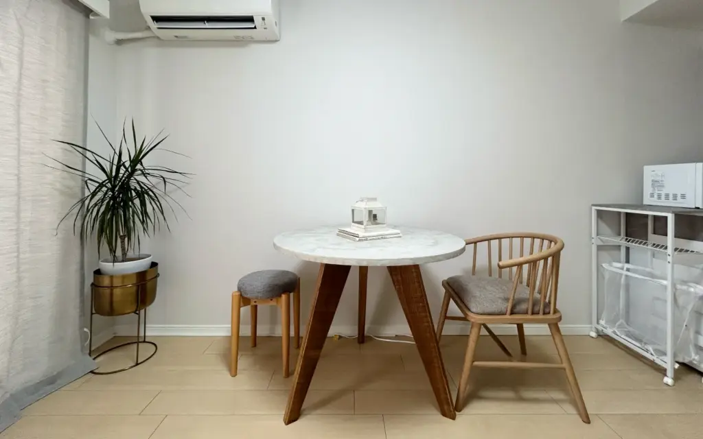 限られたワンルーム空間を効率よく使うために、ベッドや家具は空間を圧迫しないサイズ感に抑え、素材や色味でも統一感を出しております。モダンな雰囲気を意識したトーンで、無駄を省きながらも落ち着きのあるインテリアに仕上げております。